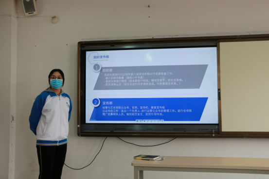 会上员工会副主席亓鹏菲介绍本学期团总支员工会各部门学期工作计划,让各班团支部书记及团学干部们更加了解团总支员工会各部门的工作内容。