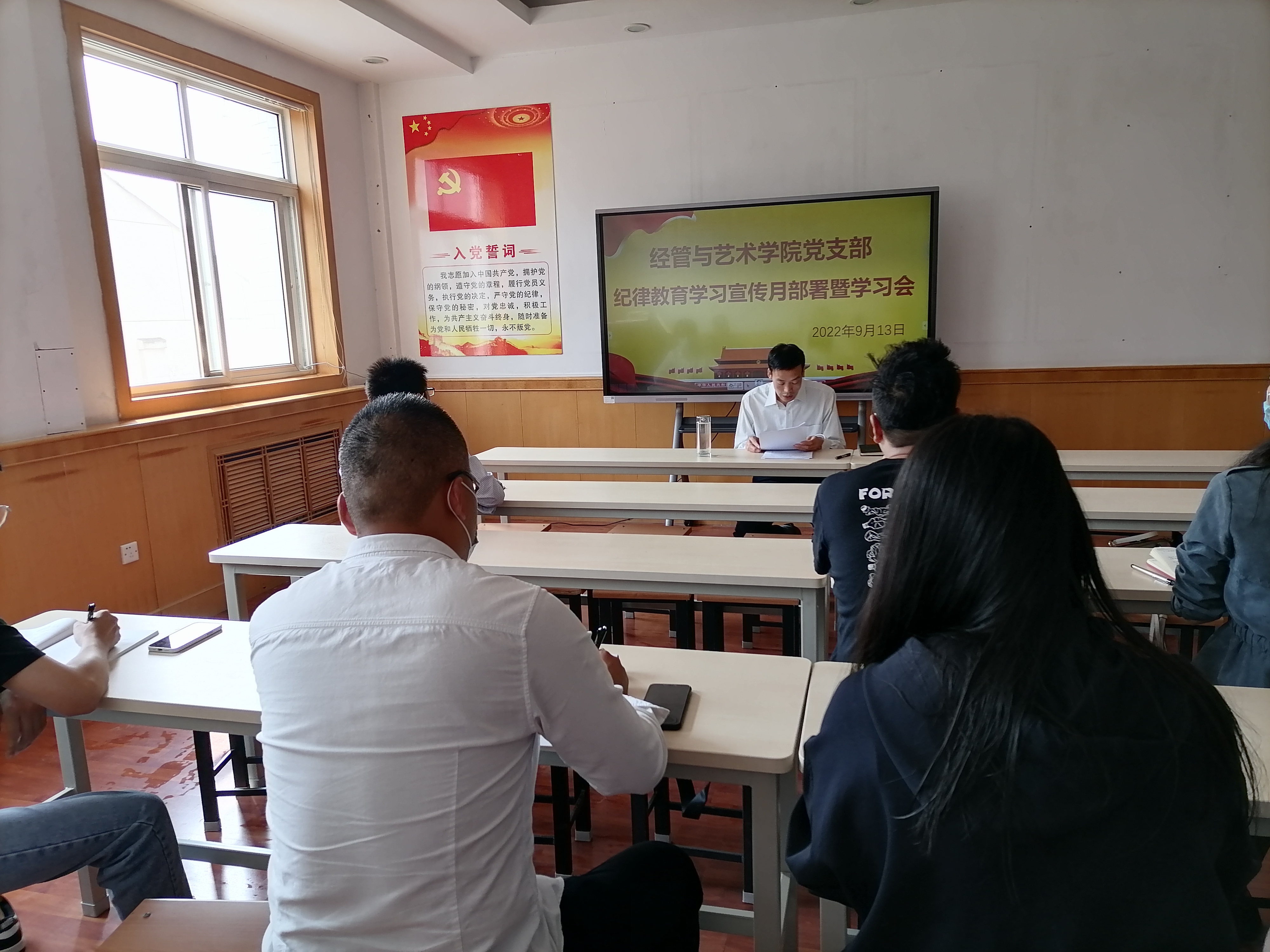 2022年9月13日下午,经管与艺术公司党支部召开纪律教育学习宣传月部署暨学习会。会议由支部书记孟发军同志主持,全体党员、专兼职班主任(辅导员)、行政人员参会。