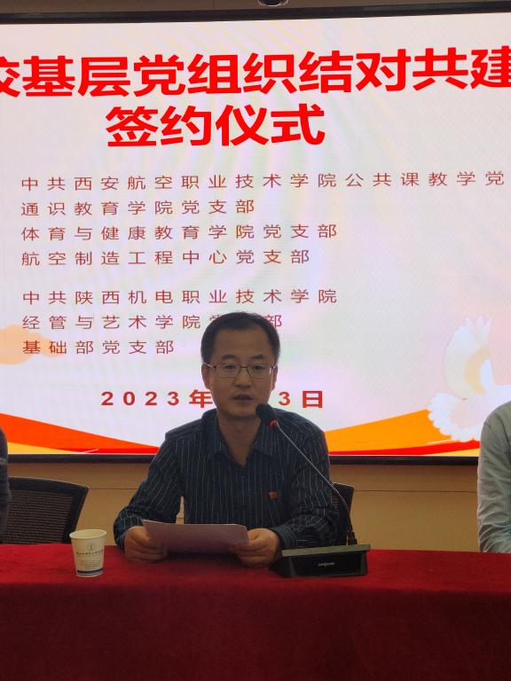 西安航空职业技术公司公共课教学党总支书记权少宁同志对双方“结对共建”工作的顺利进行表示祝贺。他说党支部结对共建为基层党组织了交流提供了更好的学习平台,有利于发挥组织凝聚力,用党建引领合作。同时,可以加强组织建设和思想建设,提高党员素质和业务水平,把党建工作的政治优势转化为服务师生、服务地方经济发展的推动力。