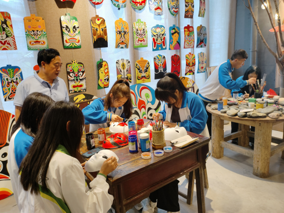 第四站,实践团队到达陇县非遗馆。在陇县文化馆党支部书记、陇县民间艺术家协会主席、陇州社火疙瘩脸谱绘制技艺省级代表性传承人杨秉权的带领下,参观了馆藏的社火脸谱、陇州皮影、陇州花灯、陇州刺绣及农具等非遗物品。重点体验了陇州社火脸谱的绘制过程,同学们看到了一个个形态各异的社火脸谱被画到了木锨、瓦片、石头等载体上,十分好奇、赞不绝口。在杨书记的教授和指导下,同学们在不同的载体上绘制着各自喜爱的社火脸谱角色,全神贯注、沉醉其中,并且在模仿的基础上进行了创新。经过一个多小时的体验,同学们绘制的社火脸谱大功告成,成就感油然而生。同学们在非遗馆不仅感受了非遗文化的魅力,也亲身体验了传承和创新非遗文化的乐趣,更学到了积极探索、勇于创新的智慧。