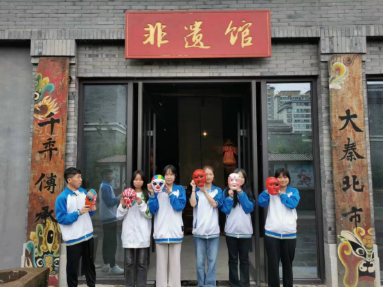 第一站,实践团队到达陇州社火广场,师生们登上陇州社火广场主题表演台,欣赏了由独具特色的社火脸谱雕刻绘制而成的巨幅主题表演台背景墙,感受了浓浓的社火文化氛围。