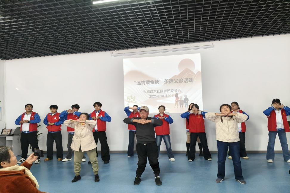 岁月有痕,招式有心。三位长辈带领志愿者练习八段锦,一招一式间,是传统养生智慧的温暖传递。