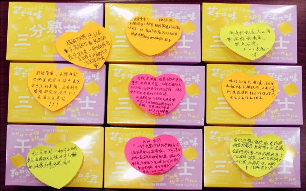 放映结束后,大家围绕着影片中的家庭关系、成长困境和幸福感等话题展开深入交流,分享彼此的心得体会和情感感悟,并将影片对心灵的触碰化为文字,写在爱心便利贴上。