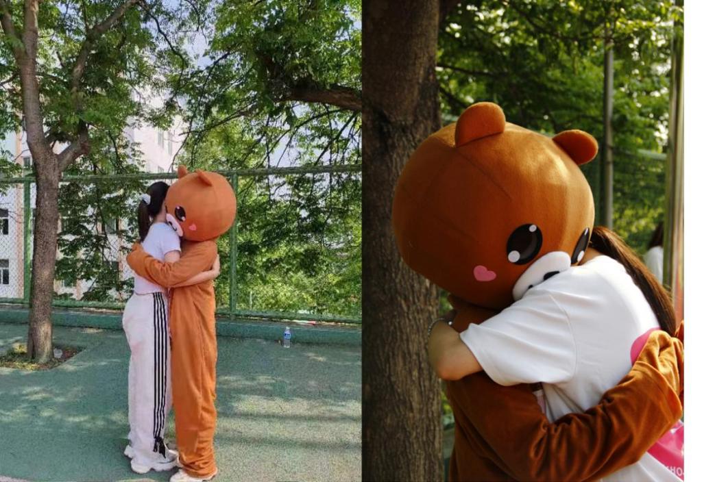 紧接着,小熊欢快地扑向了同学们,与他们进行了一场充满爱的热烈拥抱!让人的心灵深处得到了慰藉。同学们的笑容在那一刻变得更加灿烂,仿佛所有的烦恼都在小熊的拥抱中烟消云散。