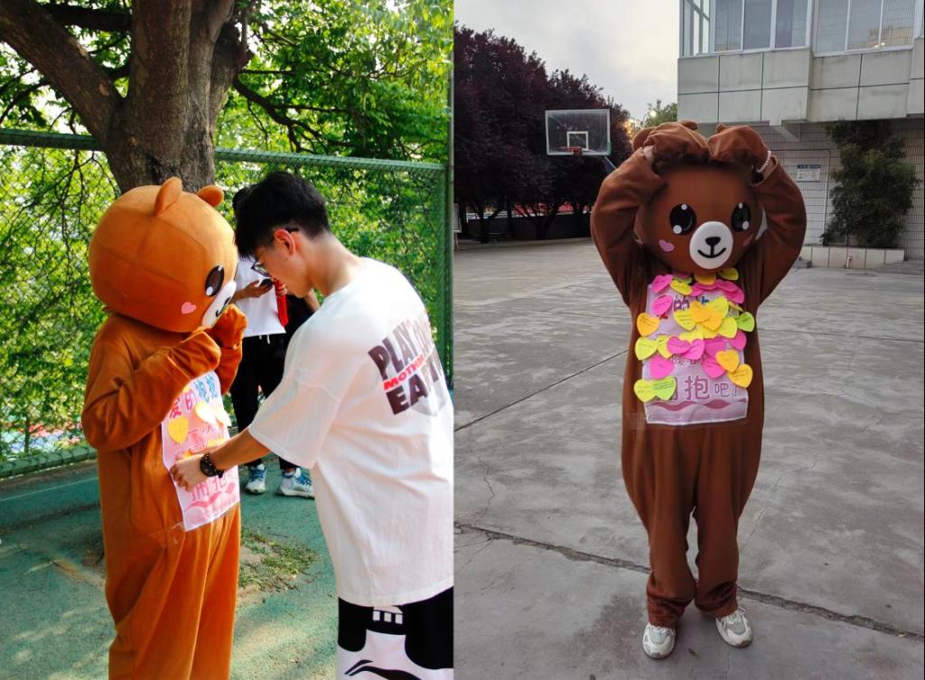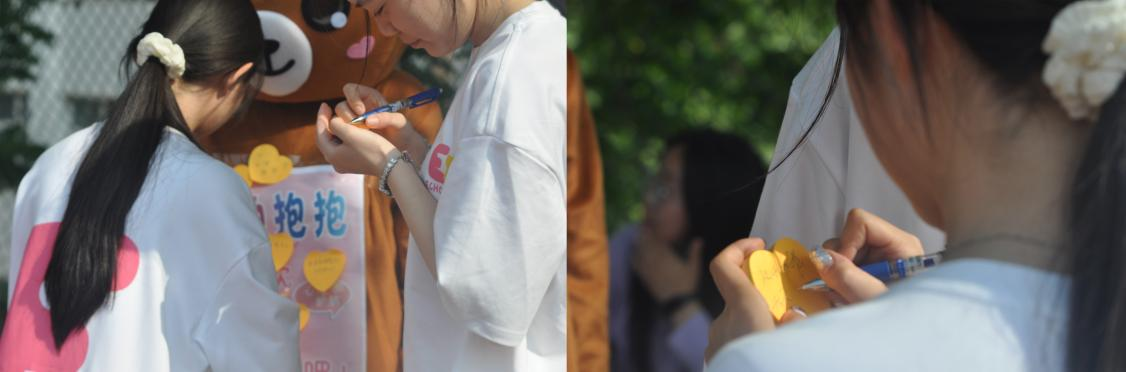 随后,众多学子纷纷将自己亲手撰写的便签递送给小熊。每一张便签都寄托了同学们的梦想与期许,犹如夜空中的繁星,虽渺小却闪耀着星辰。